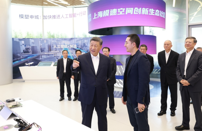 4月29日,中共中央總書(shū)記、國(guó)家主席、中央軍委主席習(xí)近平在上海考察。這是習(xí)近平在位于徐匯區(qū)的上海“模速空間”大模型創(chuàng)新生態(tài)社區(qū),聽(tīng)取相關(guān)技術(shù)研發(fā)和企業(yè)生產(chǎn)經(jīng)營(yíng)介紹。新華社記者 王曄 攝