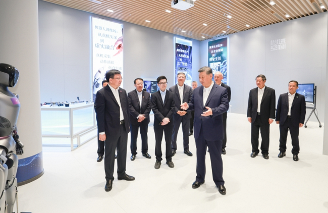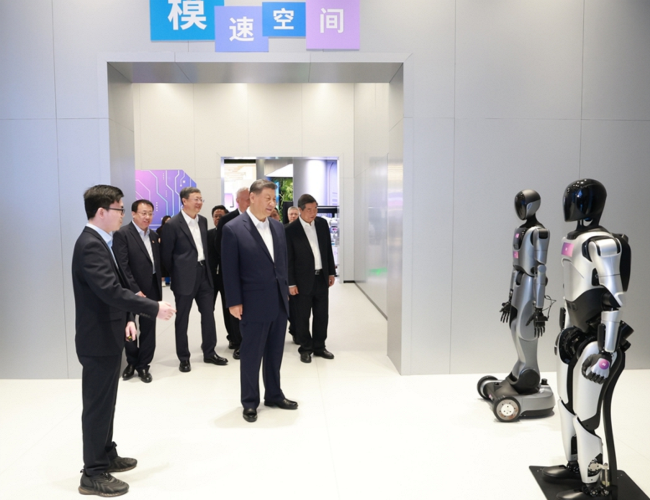 4月29日,中共中央總書(shū)記、國(guó)家主席、中央軍委主席習(xí)近平在上??疾?。這是習(xí)近平在位于徐匯區(qū)的上海“模速空間”大模型創(chuàng)新生態(tài)社區(qū)人工智能產(chǎn)品體驗(yàn)店考察。新華社記者 謝環(huán)馳 攝