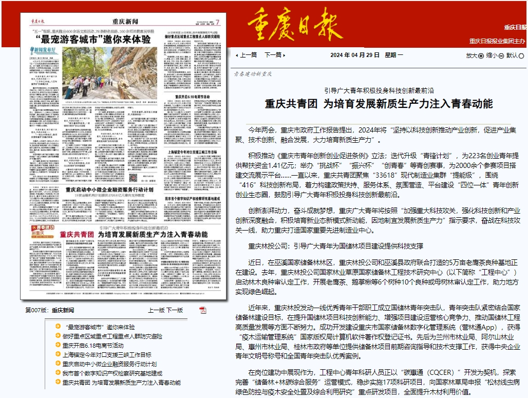重慶日?qǐng)?bào)聚焦林投青年為國(guó)儲(chǔ)林項(xiàng)目建設(shè)提供科技支撐,作題為“重慶共青團(tuán) 為培育發(fā)展新質(zhì)生產(chǎn)力注入青春動(dòng)能”的報(bào)道,刊登于重慶日?qǐng)?bào)2024年4月29日重慶新聞第7版。