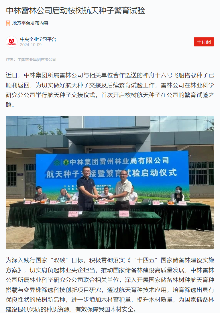 近日,“學(xué)習(xí)強(qiáng)國”學(xué)習(xí)平臺報道中林雷林公司啟動桉樹航天種子繁育試驗(yàn),現(xiàn)將報道全文分享如下: