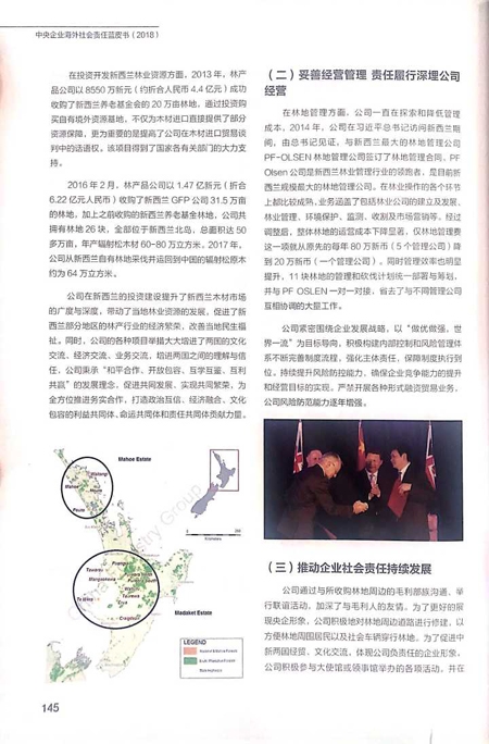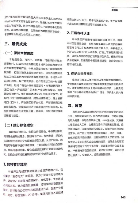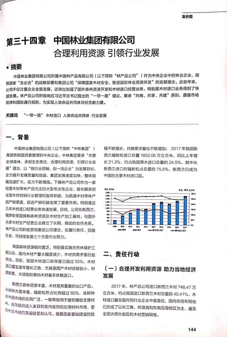 集團公司編寫的《合理利用資源 引領(lǐng)行業(yè)發(fā)展》被收錄本年度藍皮書。編委會充分肯定了集團所屬林產(chǎn)品公司積極響應(yīng)習近平總書記提出的“一帶一路”倡議,秉承“共商、共享、共建”原則,遵循市場規(guī)律和國際通行規(guī)則,依法合規(guī)開展國際化經(jīng)營,不僅促進了當?shù)亓謽I(yè)行業(yè)健康發(fā)展,改善當?shù)孛裆l?,更有效提高了中國林業(yè)企業(yè)木材進口貿(mào)易談判中的話語權(quán),為促進全球森林經(jīng)營可持續(xù)發(fā)展做出了重要貢獻。