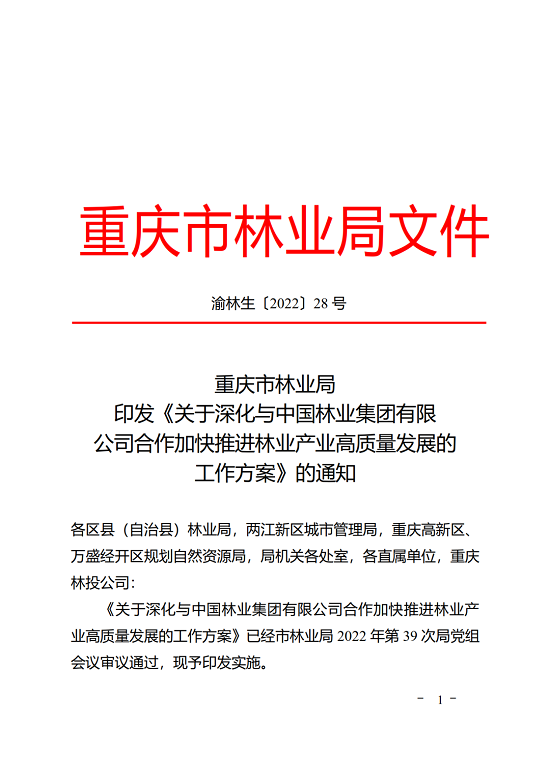 為認真落實中國林業(yè)集團與重慶市人民政府有關(guān)深化合作事宜,加快推進重慶林業(yè)產(chǎn)業(yè)高質(zhì)量發(fā)展,近日,重慶市林業(yè)局印發(fā)《關(guān)于深化與中國林業(yè)集團有限公司合作加快推進林業(yè)產(chǎn)業(yè)高質(zhì)量發(fā)展的工作方案》。