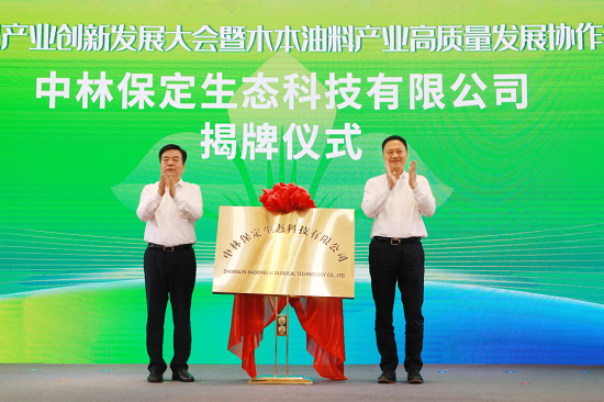 會上,余紅輝與保定市委書記黨曉龍共同為新組建的中林保定生態(tài)科技有限公司揭牌。公司未來將以央地合作模式深耕國家儲備林開發(fā)、木本油料示范區(qū)建設(shè)、良種繁育中心生產(chǎn),文冠果為主經(jīng)濟林種植,全域生態(tài)碳資產(chǎn)管理等項目的實施。在18個縣(市、區(qū))發(fā)展文冠果規(guī)?;N植,并參與建設(shè)年產(chǎn)油脂5萬噸、預(yù)計年產(chǎn)值150億元的現(xiàn)代化園區(qū),打造集文冠果等木本油料精深加工、以神經(jīng)酸提取高附加值產(chǎn)品為核心的產(chǎn)業(yè)園區(qū),為保定地區(qū)推動全國領(lǐng)先的千億級木本油料產(chǎn)業(yè)高質(zhì)量發(fā)展,助力鄉(xiāng)村振興建設(shè)。