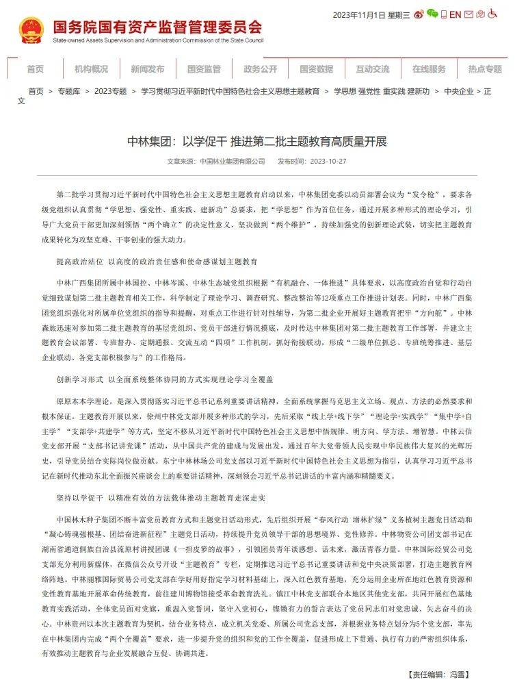 為落實(shí)中央關(guān)于在全黨深入開(kāi)展學(xué)習(xí)貫徹習(xí)近平新時(shí)代中國(guó)特色社會(huì)主義思想主題教育的重大部署,中林集團(tuán)在充分借鑒運(yùn)用第一批主題教育成功經(jīng)驗(yàn)基礎(chǔ)上,以更高站位、更高標(biāo)準(zhǔn)、更嚴(yán)要求深入開(kāi)展第二批主題教育,把各項(xiàng)工作做深入、做細(xì)致、做到位,不斷推動(dòng)主題教育走深走實(shí)。集團(tuán)第二批主題教育151個(gè)黨組織第一時(shí)間傳達(dá)學(xué)習(xí)有關(guān)精神,迅速起跑,堅(jiān)持抓好深度學(xué)與全面學(xué)相融合,主題教育和生產(chǎn)經(jīng)營(yíng)相融合,在確保主題教育見(jiàn)真、見(jiàn)實(shí)、見(jiàn)成效上下功夫。對(duì)此,國(guó)資委網(wǎng)站刊發(fā)《中林集團(tuán):以學(xué)促干 推進(jìn)第二批主題教育高質(zhì)量開(kāi)展》,對(duì)中林集團(tuán)主題教育的開(kāi)展情況給予肯定,全文分享如下: