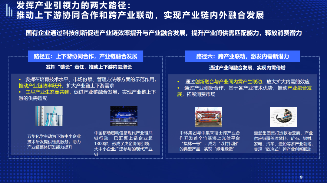 在落實擴大內(nèi)需的具體方法上,報告總結(jié)出國有企業(yè)落實擴大內(nèi)需的六大具體路徑。圍繞發(fā)揮“內(nèi)需主動力”,提出國有企業(yè)聚焦主責(zé)主業(yè),通過“拓展消費空間、催生消費業(yè)態(tài)、增加投資體量、優(yōu)化投資結(jié)構(gòu)”四大路徑,以消費品質(zhì)升級帶動傳統(tǒng)市場擴容,以規(guī)模優(yōu)勢促進品質(zhì)消費的滲透,以投資結(jié)構(gòu)的優(yōu)化帶動投資效能的提升,同時保持投資規(guī)模的合理增長。圍繞發(fā)揮“產(chǎn)業(yè)引領(lǐng)力”,提出發(fā)揮國企的輻射帶動作用,通過“產(chǎn)業(yè)鏈融合發(fā)展、跨產(chǎn)業(yè)聯(lián)動”兩大路徑,帶動上下游各類關(guān)聯(lián)企業(yè)協(xié)同發(fā)展,實現(xiàn)從投資到消費的傳導(dǎo);通過跨產(chǎn)業(yè)供需有效對接和供給創(chuàng)新,拉動內(nèi)需持續(xù)增長。