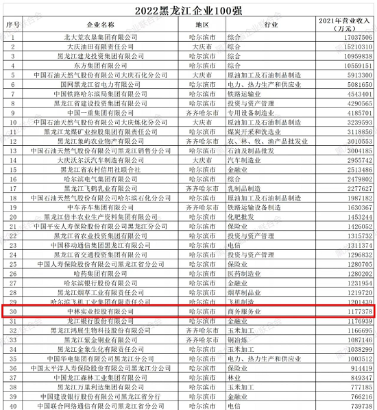 日前,黑龍江省企業(yè)聯(lián)合會(huì)在中國企業(yè)聯(lián)合會(huì)的指導(dǎo)下公示了《2022黑龍江企業(yè)100強(qiáng)名單》,中林集團(tuán)所屬中林實(shí)業(yè)控股有限公司憑借強(qiáng)勁的綜合實(shí)力和市場競爭力,位列綜合排名第30位。