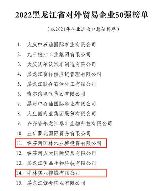 近日,《2022黑龍江省對外貿(mào)易企業(yè)50強榜單》在全省開放發(fā)展大會上發(fā)布。榜單依據(jù)2021年企業(yè)進出口總值排序,中林集團子公司中林實業(yè)控股及其下屬綏芬河國林木業(yè)城投資有限公司分別位列榜單第14位和第11位。