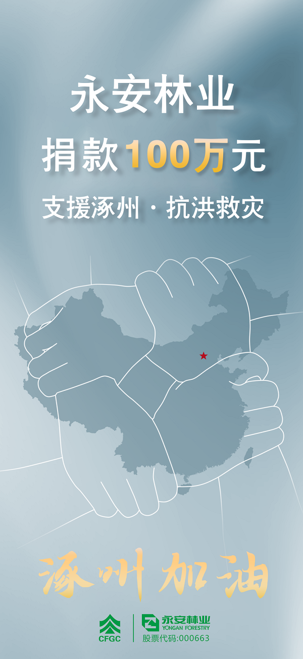 一方有難八方支援,同氣連枝守望相助。8月9日,永安林業(yè)向涿州市民政局救災(zāi)專戶捐款人民幣100萬(wàn)元,全力支持涿州市救災(zāi)保障和災(zāi)后重建工作。今后,永安林業(yè)將繼續(xù)以實(shí)際行動(dòng)踐行央企控股上市公司社會(huì)責(zé)任。