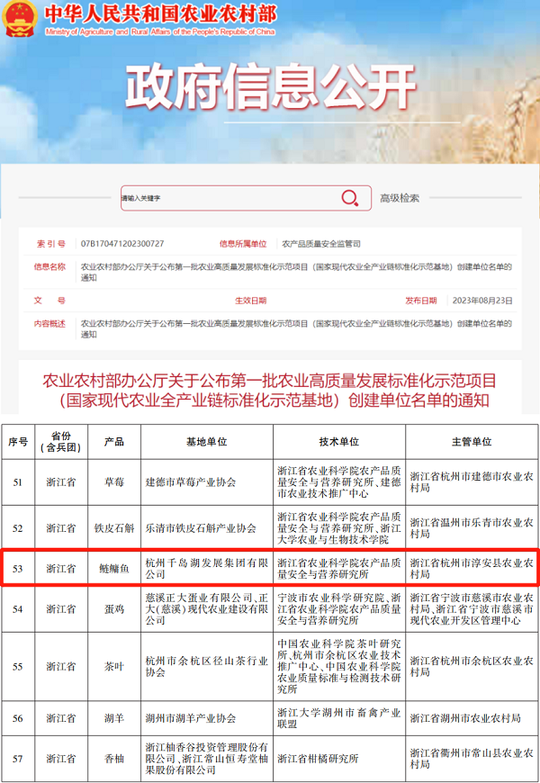 日前,農(nóng)業(yè)農(nóng)村部辦公廳公布了第一批農(nóng)業(yè)高質(zhì)量發(fā)展標準化示范項目(國家現(xiàn)代農(nóng)業(yè)全產(chǎn)業(yè)鏈標準化示范基地)創(chuàng)建單位名單,中林千島湖發(fā)展有限公司憑借著在有機鰱鳙魚全產(chǎn)業(yè)鏈標準化方面的不懈探索和實踐成為首批入選的企業(yè),這也是浙江省獲批創(chuàng)建的8個示范基地中唯一的淡水企業(yè)。