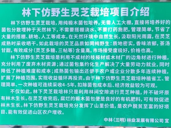 中林三明公司積極探索共享林下經(jīng)營模式,充分利用林下中藥材多花黃精種植先驅(qū)經(jīng)驗,于2023年5月中旬在將樂縣??诖宥嗷S精種植基地套種仿野生椴木紫靈芝,打造了集多元化于一體的小型循環(huán)生態(tài)系統(tǒng)基地,共完成種植3000余株,以點帶面,將逐步擴大種植面積,成為輻射周邊地區(qū)的示范基地?,F(xiàn)種植的仿野生椴木紫靈芝部分已進入成熟期,后續(xù)將陸續(xù)開展靈芝的采收工作。