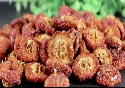 用海紅果制成果脯、果丹皮等食品,酸甜適口,老少咸宜,具有健脾胃、增食欲、助消化等功效。海紅果干可以直接食用也可泡水喝。