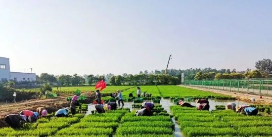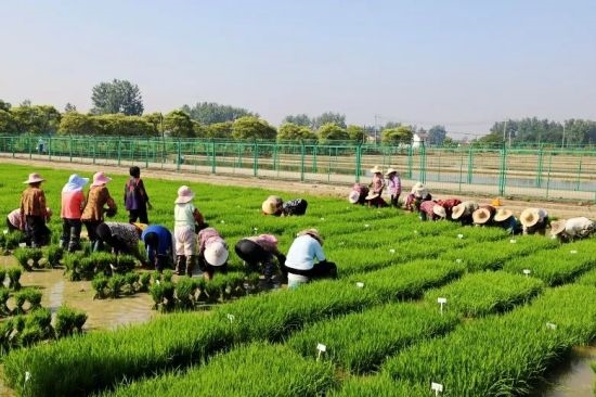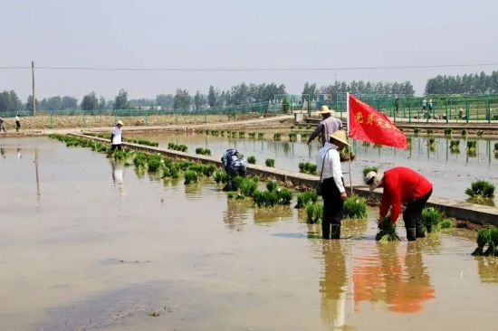 在平坦的稻田里,工人們辛苦勞作,轉(zhuǎn)眼間,一塊塊空蕩蕩的黑土地披上了嶄新的綠裝。放眼望去,一棵棵秧苗挺立在水中,翠綠喜人,在風(fēng)的吹拂下,像一串串躍動的音符,在稻田里交奏出最美的田園樂章,一幅辛勤勞作的初夏農(nóng)耕圖在田地里徐徐展開。
