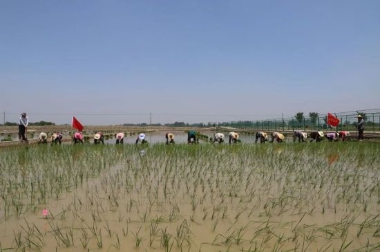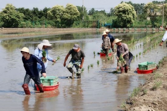 在平坦的稻田里,工人們辛苦勞作,轉(zhuǎn)眼間,一塊塊空蕩蕩的黑土地披上了嶄新的綠裝。放眼望去,一棵棵秧苗挺立在水中,翠綠喜人,在風(fēng)的撥弄下,像一串串躍動(dòng)的音符,在稻田里交奏出最美的田園樂章,一幅辛勤勞作的初夏農(nóng)耕圖在田地里徐徐展開。