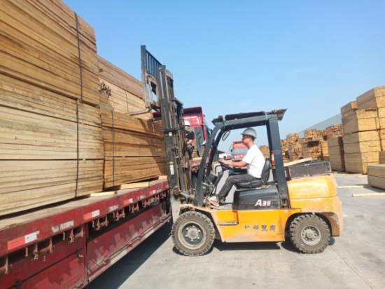 嚴(yán)格把關(guān) 安全生產(chǎn) 林場(chǎng)集團(tuán)所屬西安中林國(guó)鐵物流的叉車司機(jī)(裝車員)根據(jù)客戶選材的種類和規(guī)格,從貨場(chǎng)不同木材堆垛中,找到對(duì)應(yīng)品類,叉取木材運(yùn)送到貨車上,在不超重、不超高的范圍之內(nèi)合理裝車擺放,確保貨車運(yùn)輸途中木材安全。(攝影:楊霜)
