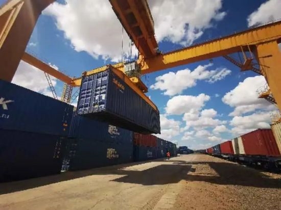 林場集團(tuán)所屬滿洲里伊利托物流基地現(xiàn)場部門式起重機(jī)駕駛員正將查驗(yàn)合規(guī)的“中歐班列”集裝箱進(jìn)行寬軌換準(zhǔn)軌的換裝作業(yè),木材經(jīng)換裝,分別發(fā)往國內(nèi)各陸港或指定目的地。(攝影:張?jiān)撇?/p>