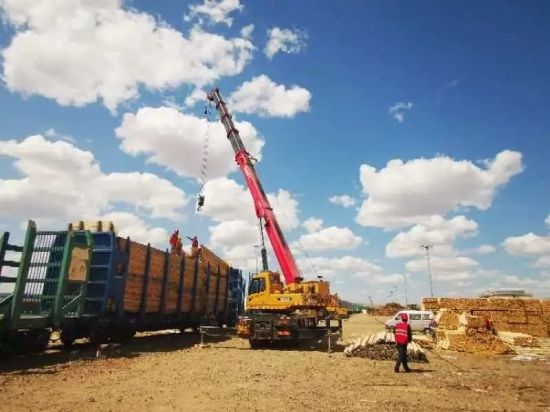 林場集團(tuán)所屬滿洲里伊利托物流基地現(xiàn)場部人員操作吊車、裝載機(jī)緊密配合,將木材從列車廂倒垛、轉(zhuǎn)堆到貨車廂,安全高效的換裝作業(yè),為客戶縮短了收貨時(shí)間。(攝影:張?jiān)撇?/p>