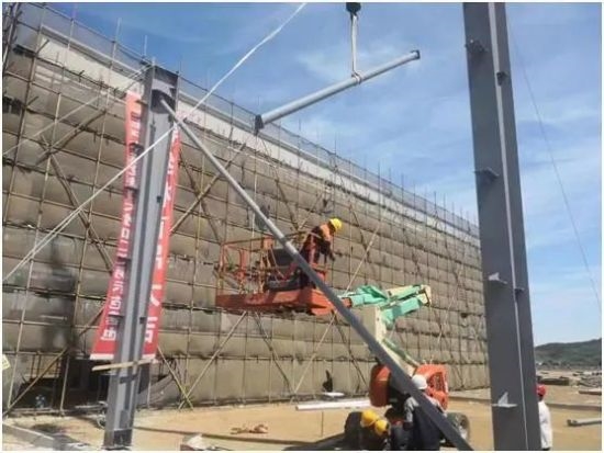 綜合樓曲臂升降車安裝柱間支撐構(gòu)件作業(yè)