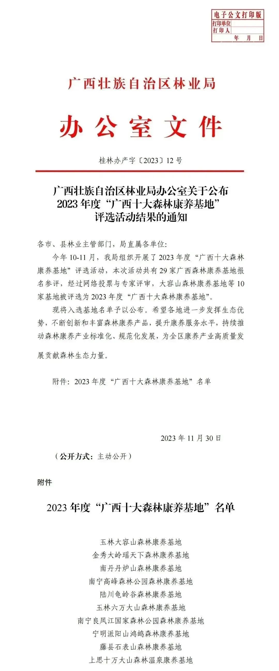 近日,廣西壯族自治區(qū)林業(yè)局辦公室公布了2023年度廣西十大森林康養(yǎng)基地名單,中林廣西所屬中林生態(tài)城推薦的南寧良鳳江國(guó)家森林公園登榜獲評(píng)。