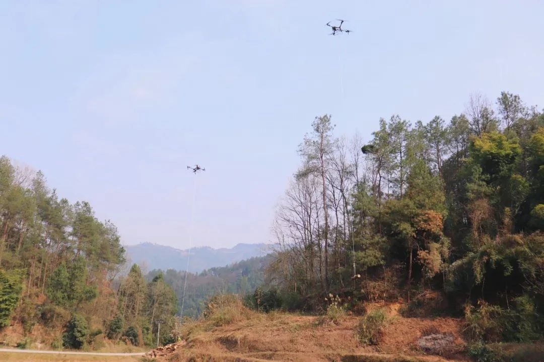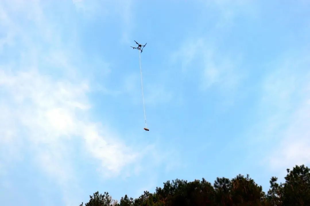 伴隨著一陣雄渾的轟鳴聲,兩架多旋翼無人機(jī)猶如矯健的雄鷹迅速升空,它們各自攜帶著粗壯的繩索,在操控者的精準(zhǔn)操作下,敏捷地穿梭于山巒之間,快速定位到一處松材線蟲病疫木堆放點。地面人員迅速將松木捆綁并掛上掛鉤,無人機(jī)隨即穩(wěn)穩(wěn)地拉起一百多斤重的疫木,向著目的地飛去。僅僅三分鐘,從吊裝、轉(zhuǎn)運(yùn)到卸載,整個過程一氣呵成,高效至極。