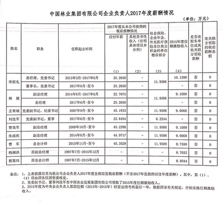 中國林業(yè)集團有限公司企業(yè)負責人2017年度薪酬情況