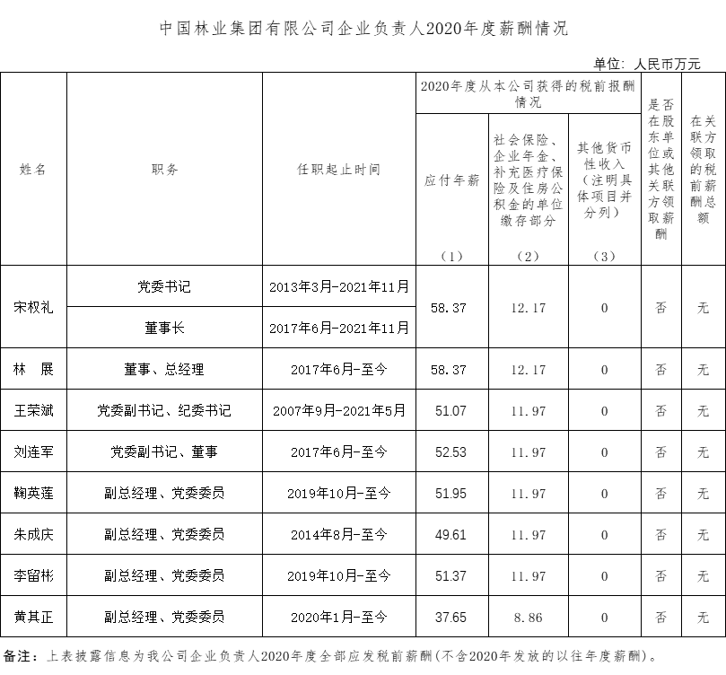 中國林業(yè)集團(tuán)有限公司企業(yè)負(fù)責(zé)人2020年度薪酬情況