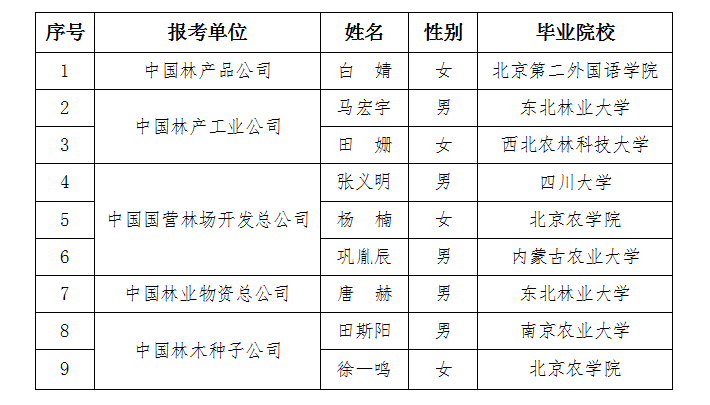 中國(guó)林業(yè)集團(tuán)公司2016年第一批次公開招聘應(yīng)屆高校畢業(yè)生工作,已完成資格審查、筆試、面試和入職體檢等環(huán)節(jié)。經(jīng)研究,集團(tuán)公司在京單位擬聘用白婧等9名同志,具體名單如下: