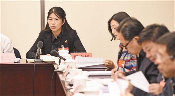 上圖 10月20日,黨的十九大代表、中國林業(yè)集團公司安徽歙縣披云山莊有限公司餐廳領班晏文娟(左一)在分組會上發(fā)言表示,黨的十九大報告中的生態(tài)文明建設富有深遠意義,綠水青山就是金山銀山的理念已經(jīng)深入人心。本報記者 高興貴攝