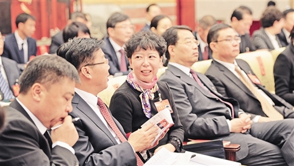 右圖 黨的十九大代表、遼寧營口第六中學教師丁唯秀(左三)和同團代表討論報告,她認為教育工作者應該苦練教書育人本領,不辜負習近平總書記的希望和囑托。本報記者 李景錄攝