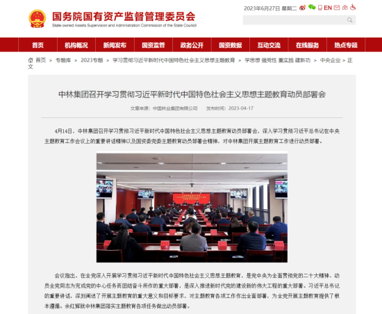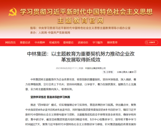 近日,中央主題教育官網(wǎng)、國(guó)資委網(wǎng)站、國(guó)資委主題教育簡(jiǎn)報(bào)相繼報(bào)道聚焦集團(tuán)主題教育開(kāi)展情況、實(shí)際成效和好經(jīng)驗(yàn)、好做法,對(duì)中林集團(tuán)主題教育開(kāi)展情況給予充分肯定。