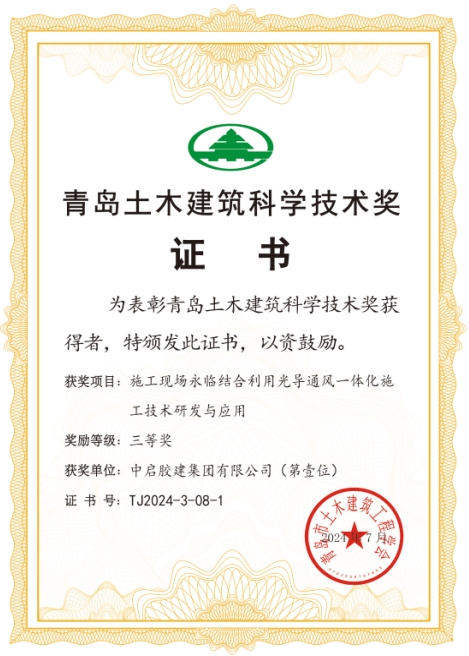 日前,在青島市土木建筑工程學(xué)會首次開展的“青島土木建筑科學(xué)技術(shù)獎”評選活動中,我公司的研發(fā)項目《施工現(xiàn)場永臨結(jié)合利用光導(dǎo)通風一體化施工技術(shù)研發(fā)與應(yīng)用》榮獲三等獎。