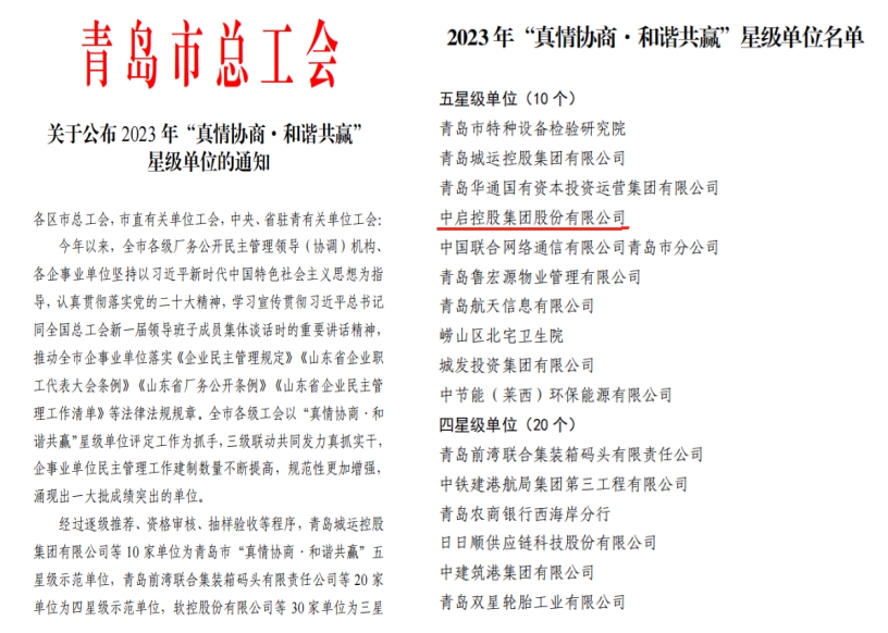 近日,青島市總工會(huì)發(fā)布《關(guān)于公布 2023 年“真情協(xié)商·和諧共贏”星級(jí)單位的通知》,中啟控股集團(tuán)股份有限公司喜獲2023 年“真情協(xié)商·和諧共贏”五星級(jí)示范單位。